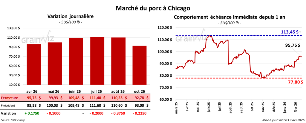 Le contrat de porc américain avril 26 a clôturé à 95,75 $ (+ 18 cents). Celui mai 26 a fermé à 99,93 $ (- 10 cents). Celui juin 26 a terminé à 109,48 $ (0,0).
