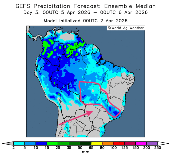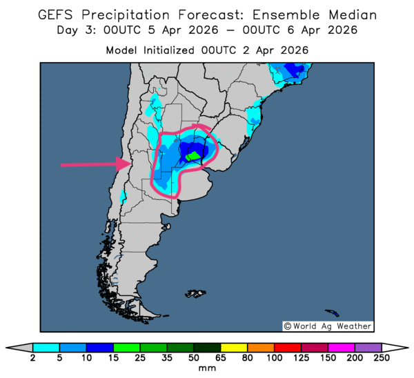 - Essentiellement, les prévisions météorologiques sont satisfaisantes à court terme pour l’Argentine. L’analyse des cartes GFS (World Ag Weather) jusqu’au 3e jour montre des possibilités de précipitations dans plusieurs secteurs du centre et de l’est du pays. Des provinces comme San Luis, Córdoba, Santa Fe, Entre Ríos et Buenos Aires pourraient recevoir des pluies bénéfiques. Toutefois, certains secteurs du Nord et du Sud manquent toujours d’humidité.
