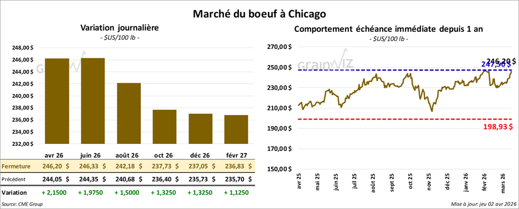 Le contrat de bœuf américain de juin 26 a clôturé à 246,33 $ (+ 1,98 $). Celui d’août 26 a clôturé à 242,18 $ (+ 1,50 $). Celui d’octobre 26 a terminé à 237,73 $ (+ 1,33 $).