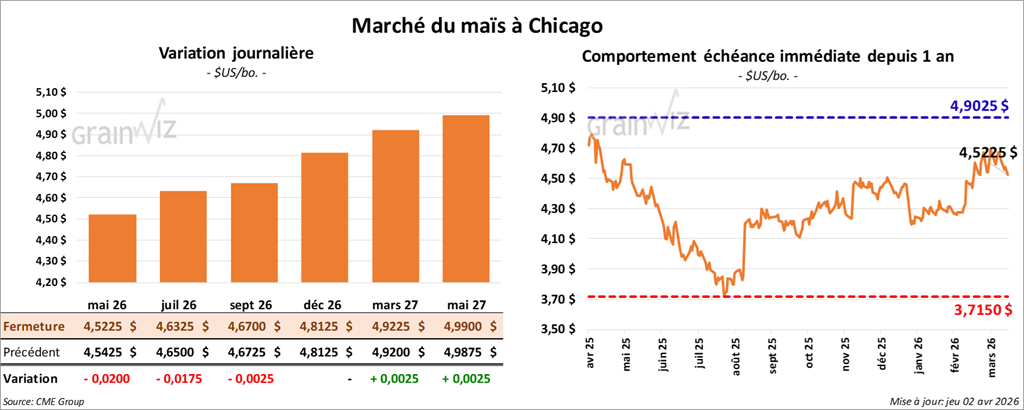 Le contrat de maïs américain de mai 26 a clôturé à 4,5225 $ (- 2 cents). Celui de juillet 26 a clôturé à 4,6325 $ (- 1 ¾ cent). Celui de septembre 26 a terminé à 4,6700 $ (- ¼ cent).