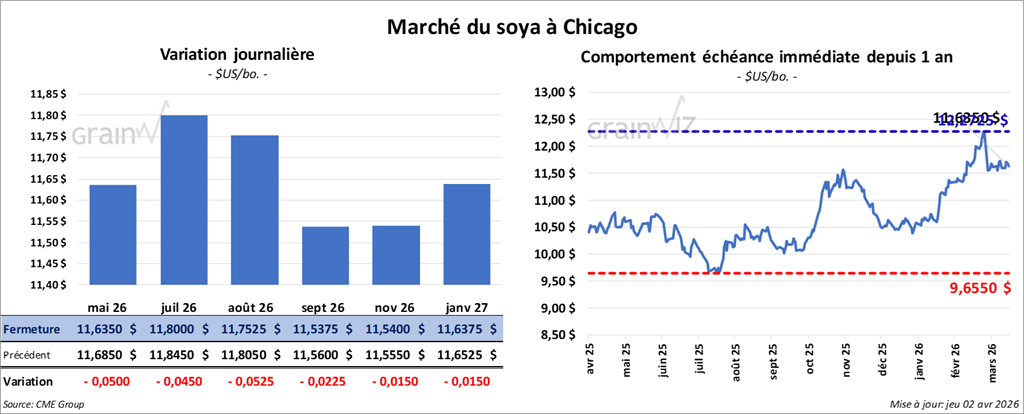 Le contrat de soya américain de mai 26 a clôturé à 11,6350 $ (- 5 cents). Celui de juillet 26 a clôturé à 11,8000 $ (- 4 ½ cents). Celui d’août 26 a terminé à 11,7525 $ (- 5 ¼ cents).