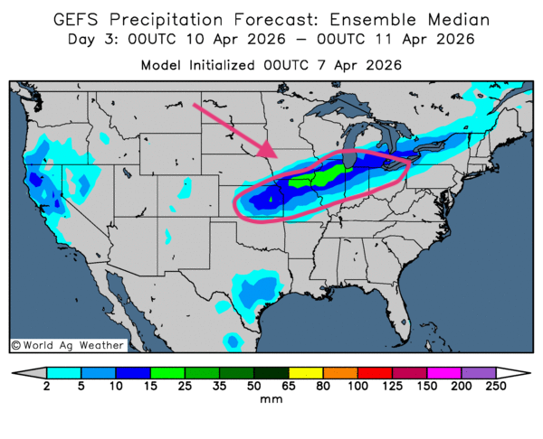 - Comme le montre cette carte GFS (World Ag Weather) dessinée pour le 3e jour, des possibilités de pluie pourraient toucher le sud des Grands Lacs et même s’étendre plus à l’ouest, vers le Kansas, en passant par l’Iowa, le Missouri et l’Illinois.
