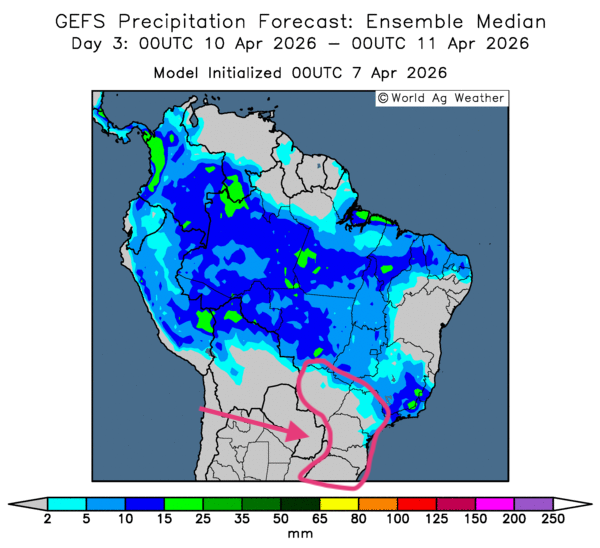 - Globalement, certains changements météorologiques s’observent à court terme au Brésil. L’analyse des cartes GFS (World Ag Weather) illustrées jusqu’au 3e jour révèle des possibilités de pluie pour le centre, le Nord et certaines parties de l’est. Par contre, comme le montre cette carte du 3e jour, un manque de précipitations persiste surtout dans le sud et le sud-est. À terme, cette sécheresse devrait engendrer un stress hydrique toujours plus important dans ces secteurs. Dans l’ensemble, les prévisions météorologiques restent toutefois favorables pour une bonne partie du Brésil.