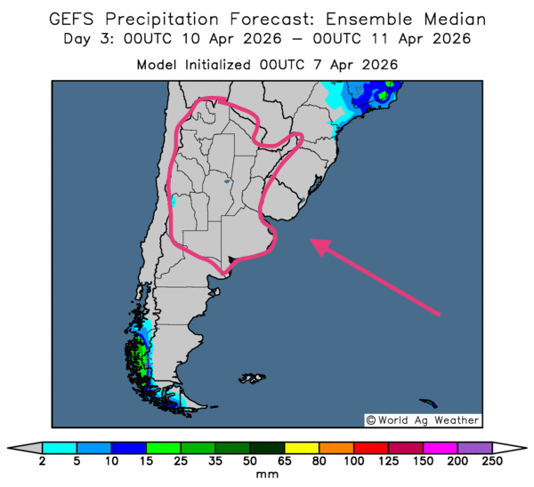 - Essentiellement, les conditions météorologiques sont à surveiller à court terme en Argentine. L’analyse des cartes GFS (World Ag Weather) illustrées jusqu’au 3e jour indique, comme le montre cette carte du 3e jour, des possibilités de temps sec persistantes à l’échelle du territoire. Par conséquent, le stress hydrique subi par les différentes cultures pourrait s’intensifier.