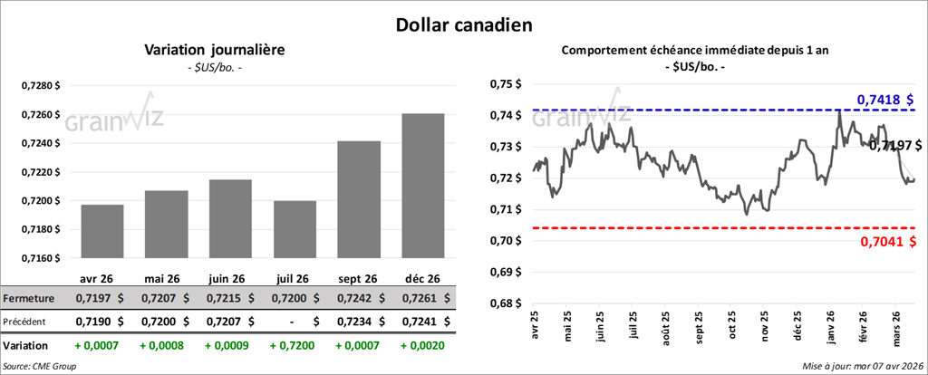 Du côté de l’huile de soya américaine, le contrat échéance mai 26 a terminé à 69,72 $ (- 23 points). Celui de juillet 26 a terminé à 69,40 $ (- 24 points).