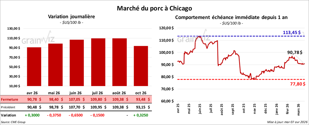 Le contrat de porc américain échéance mai 26 a clôturé à 98,40 $ (- 38 cents). Celui de juin 26 a clôturé à 107,05 $ (- 65 cents). Celui de juillet 26 a terminé à 109,80 $ (- 15 cents).