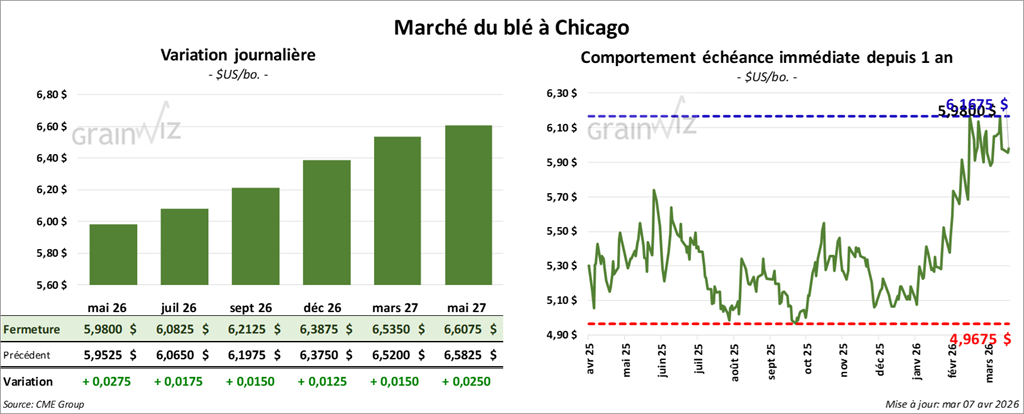 À Chicago, le contrat de blé échéance mai 26 a clôturé à 5,9800 $ (+ 2 ¾ cents). Celui de juillet 26 a clôturé à 6,0825 $ (+ 1 ¾ cent). Celui de septembre 26 a terminé à 6,2125 $ (+ 1 ½ cent).