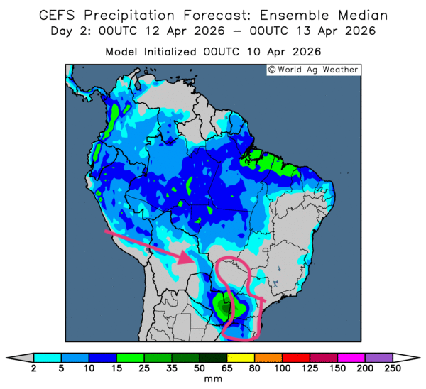 • Globalement, les prévisions météorologiques s’améliorent à court terme au Brésil. L’analyse des cartes GFS (World Ag Weather) illustrées jusqu’au 3e jour indique un temps plus sec, mais favorable, dans la plupart des régions de production. Comme le montre cette carte du 2e jour, des précipitations bénéfiques pourraient toucher les régions asséchées du sud-est, du sud du Mato Grosso do Sul jusqu’au Rio Grande do Sul, en passant par le Paraná et le Santa Catarina.