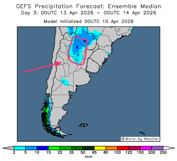 • Essentiellement, les prévisions météorologiques sont correctes à court terme en Argentine. L’analyse des cartes GFS (World Ag Weather) tracées jusqu’au 3e jour révèle un temps sec persistant à l’échelle du territoire. Par contre, comme le montre la carte du 3e jour, des précipitations plus ou moins légères pourraient se dessiner dans certaines portions du nord de l’Argentine. À noter qu'il est quand même vrai que l'humidité des sols dans certaines parties du centre du pays restent adéquates.