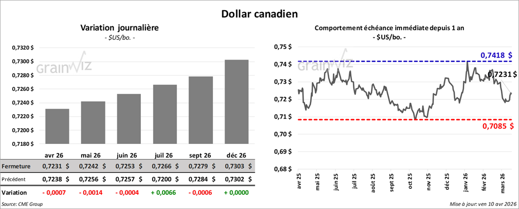 Du côté de l’huile de soya, le contrat mai 26 a terminé à 67,09 $ (- 61 points). Celui juillet 26 a fini à 67,02 $ (- 60 points).