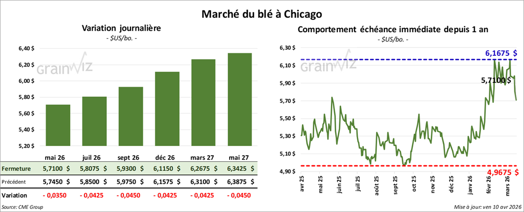 À Chicago, le contrat de blé mai 26 a clôturé à 5,7100 $ (- 3 ½ cents). Celui juillet 26 a fermé à 5,8075 $ (- 4 ¼ cents). Celui septembre 26 a terminé à 5,9300 $ (- 4 ½ cents).