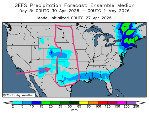 • De manière générale, les conditions météorologiques  pour les États-Unis restent favorables à court terme. Par contre, l’analyse des cartes GFS (World Ag Weather), dessinées jusqu’au 3e jour, montre des possibilités de pluies parfois abondantes autour et au sud des Grands Lacs. Dans une certaine mesure, les précipitations pourraient cependant demeurer déficitaires dans certaines parties du nord des Plaines américaines. Comme l’indique cette carte du 3e jour, des pluies légères pourraient toucher les secteurs asséchés du centre et du sud des Plaines américaines. Elle montre aussi des possibilités de temps sec dans le nord des Grandes Plaines.