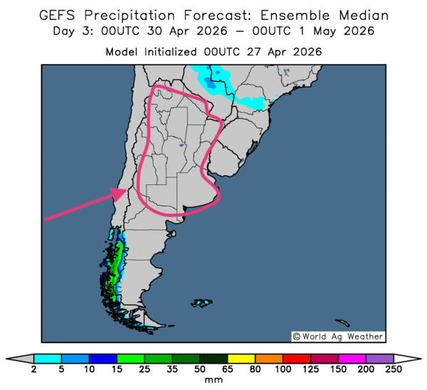 • Essentiellement, les prévisions météorologiques demeurent à surveiller à court terme pour l’Argentine. L’analyse des cartes GFS (World Ag Weather), tracées jusqu’au 3e jour, révèle des possibilités de temps sec persistant sur l’ensemble du territoire de production. À terme, ces conditions pourraient néanmoins entraîner du stress hydrique chez plusieurs cultures, même si l’humidité du sol reste correcte à de nombreux endroits (voir notamment la carte du 3e jour ci-contre).