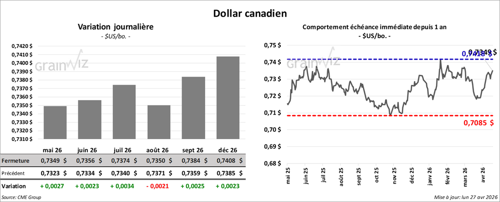 Du côté de l’huile de soya américaine, le contrat mai 26 a terminé à 72,26 $ (+ 35 points). Celui de juillet 26 a fini à 71,67 $ (+ 34 points).