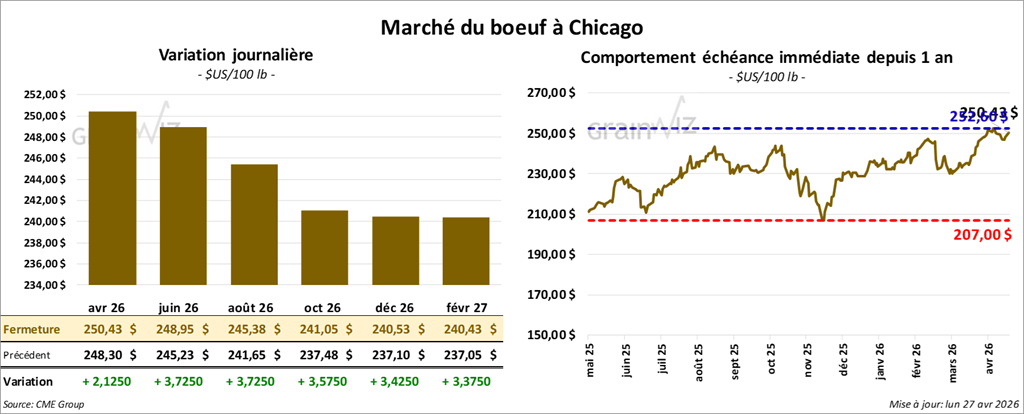 Le contrat de bœuf américain juin 26 a clôturé à 248,95 $ (+ 3,73 $). Celui d’août 26 a fermé à 245,38 $ (+ 3,73 $). Celui d’octobre 26 a terminé à 241,05 $ (+ 3,58 $).