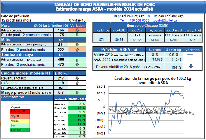 La marge du modèle N-F de la FADQ est en baisse sur les prix de fermeture de vendredi vs la semaine passée, nous sommes présentement à 6$ de marge par porc de 100 kg carcasse.