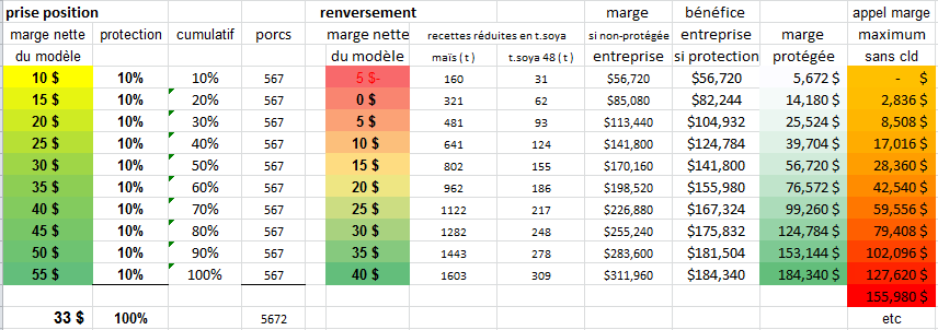 Dans ce cas-ci plus haut , pour rester simple à gérer, le déclencheur est basé sur la marge de profit que ferait que la ferme modèle naisseur-finisseur de la Financière Agricole , mais cela pourrait être basé aussi sur le profit réel que vous calculez faire chez vous. Nous parlerons de la protection des grains dans une prochaine chronique.