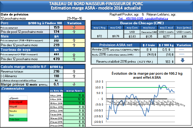 Le revenu stabilisé estimé est de +/- 183 $/100 kg, ce qui représente le revenu minimum garanti pour la vente des porcs en date de mars 2016. Si dans votre entreprise, votre seul revenu est la vente de porcs, vous devez vous poser la question si vous êtes en mesure de produire un porc à ce prix. Le coût d’alimentation est de +/- 118 $, donc pour un naisseur-finisseur, l’ensemble des autres charges variables et fixes ainsi que le remboursement du capital (au lieu de l’amortissement) est-il à 65 $/100 kg ou moins pour arriver au revenu stabilisé? Ce n’est pas évident pour bien des producteurs.