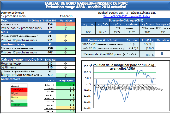 - La moyenne de la marge dégagée au réel d’avril 2015 à avril 2016 (l'an passé ) est de (-0,1 $/porc) versus une moyenne positive pour la prochaine année.