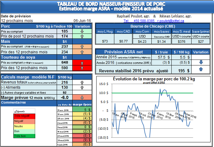 Bon matin, la marge de la ferme modèle ASRA de 306 truies et 5672 porcs produits par an est ce lundi de - 6 $ par porc ( un porc de 100 kg rapporte 193$ pour l’année à venir, mais avec le prix des grains, le prix stabilisé serait de 199$ ) , selon les prix de fermeture de la bourse de vendredi dernier.