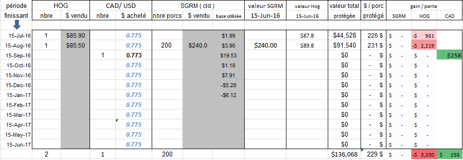 Bonjour , les hog ont encore monté hier, et avec la baisse présente du CAD, cela donne des prix au Québec pour l’été 2016 plus qu’intéressants; les porcs à livrer pour août rapporteraient 214 $ de prix de pool, 236 $ à 100 kg carcasse ( le cld 8 affiche 240$ , mais la fédération a mis une base de 4$ dans ce prix ) ; pourtant les prix pour l’automne/hiver sont beaucoup plus bas, que 157 $ de prix de pool pour décembre, soit un écart de 62$ par porc.
