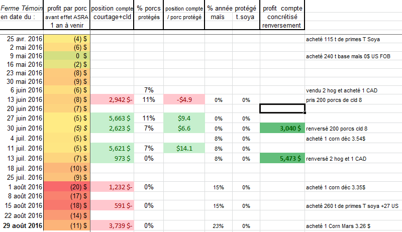 Le maïs est en baisse aujourd'hui, 3.16 $ pour décembre, 3.26 $ pour mars 2017; la ferme Témoin naisseur-finisseur de 5672 porcs produits par an a un besoin de 1600 tonnes de maïs de par an, elle va donc acheter un contrat de Corn de mars 2017 , possédant déjà 2 contrats de décembre, présentement en appel de courtage ( afin de répartir ses positions dans le temps, les 2 premiers contrats de maïs devront être renversés le 1er décembre.... 0.10 $ le boisseau entre décembre et mars correspond à 4$ la tonne , ou un peu plus que 1$ par mois.... ) .
