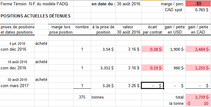 À 3.16$ sur décembre, le prix de bourse actuel correspond à du maïs à 165 $ pris à la ferme si la base est comme la moyenne 5 ans ( 0$ US ), mais avec un prix aussi bas à Chicago, il faut assumer que la base sera plus forte ( moins de pression de battage ), avec une base de 0.18 $ US cela nous donnerait du maïs 175$ pris à la ferme ( 1.29 $ base courante en CAD). La ferme témoin aura maintenant près de 25% de son maïs annuel protégé avec 3 contrats ( 3 x 125 t ).