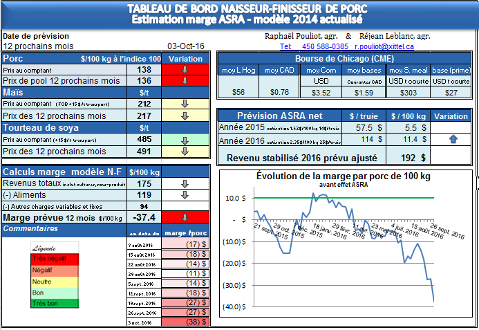 Les Hog ont chûté limit down vendredi avant la parution du rapport trimestriel du Hog and Pig, sur l’anticipation que les inventaires seraient très élevés ( à la parution du rapport, ils le sont ! plus élevés que ce que les analystes prévoyaient ). Le prix de pool pour un 1 an à venir est maintenant 136$ du 100 kg indice 100, soit 151 $ par porc de 100 kg. Sur ce graphique ci-bas on peut voir que la marge à venir est maintenant aussi basse que celle lors de la crise des revenus d’il y a 5 ans, de biens mauvais souvenirs ( ce graphique représente l’évolution des prix futurs offerts, et non pas les prix au comptant réels que vous avez eu.... ) . Le prix de pool pour décembre est de 106$, un éleveur en lot tout plein tout vide entrant un porcelet avec entente en septembre 2016 (70 $ à 30 kg ) , produirait des porcs avec une perte sur charges variables de 48$ par porc.... par conséquence Le porcelet de 55 livres de l’Ontario vaut 35 $ pris là-bas à 55 livres, 40 $ rendu au Québec; les porcelets au sevrage sont environ 20 $ livrés. Notre calcul d’ASRA nette à venir pour 2016 affiche présentement 11.4 $ par porc de 100 kg et 114$ par truie.