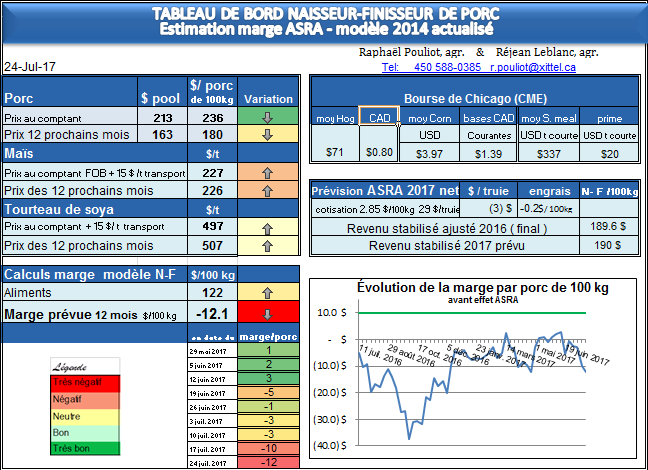Aujourd’hui lundi 24 juillet, la marge par porc du modèle pour les 12 mois à venir est encore plus négative que la semaine passée, -12.10 $ par porc de 100 kg carcasse.