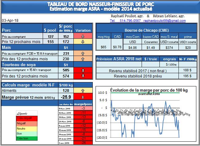 La marge par porc est juste à – 26 $/porc, rester positif vous avez votre belle béquille qu’est l’ASRA. Au cours de la dernière année, sur 53 semaines, vous avez été positif que 12 semaines et jamais plus de 5 $/porc. Au cours des deux dernières, 15 semaines.