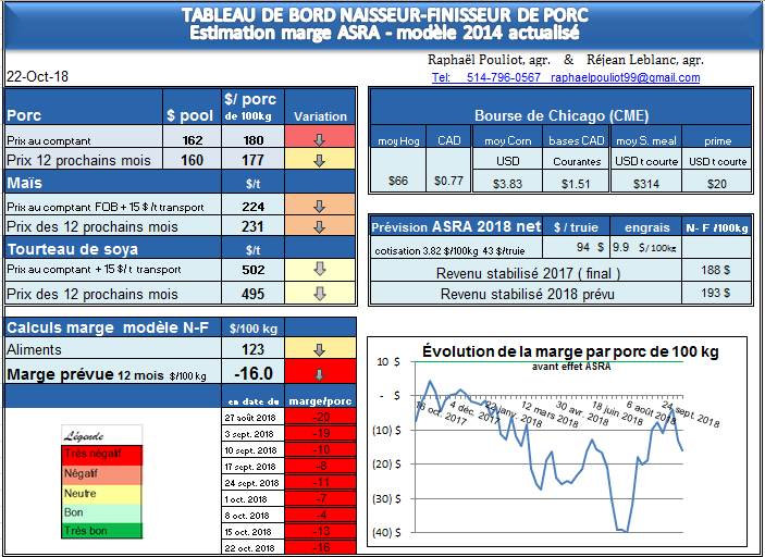 lundi 22 octobre, la marge 1 an est en baisse à –16$ par porc.