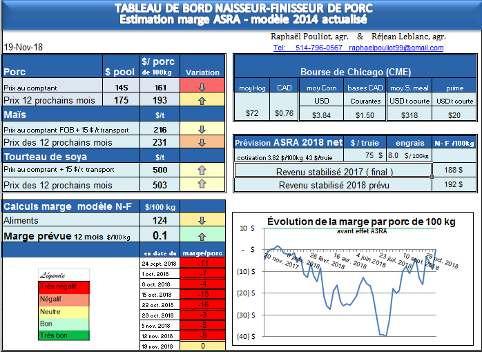 Le prix du maïs demeure élevé au Québec et cela s’explique par la base et non la valeur des contrats à Chicago, donc si vous pouvez sécuriser un prix en bas de 231 $, cela pourrait être bien et ensuite vous pouvez toujours utiliser les options pour vous protéger contre une baisse éventuelle. Pour ce qui est du tourteau, il reste aux alentours de 500 $/t, plus haut que le bas de septembre, mais il faut se demander à ce stade-ci si les prix vont redescendre en bas du 500 $/t. Pour ce qui est du prix du porc, cela faisait longtemps que la marge a atteint zéro, donc il peut avoir des opportunités pour sécuriser des marges, tant via des contrats que via les CLD. Il semble avoir une surprime reliée aux incertitudes face à la peste porcine. Le hic en ce moment est qu’elle est l’état de la situation en Chine et dans les autres pays touchés. Donc, il faut bien suivre ces positions le cas échéant.