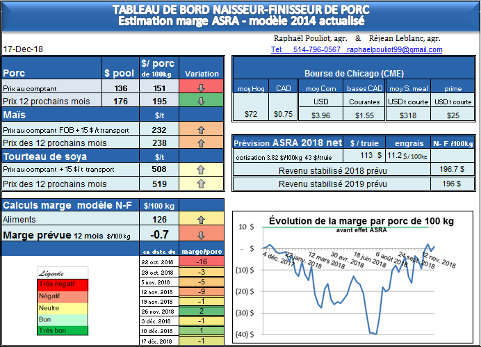 Du 26 mars au 3 septembre la marge moyenne par porc 1 an fut de – 24 $. Depuis ce temps, elle a été de – 6 $/porc avec des semaines positivea. Le prix de pool 1 an est maintenant de 176 $/100 kg. Cela s’explique tant par la baisse moyenne de la valeur de notre devise pour la prochaine année, que par la hausse du prix de pool à l’indice 100. Au cours des dernières années, le prix de pool moyen à l’indice 100 fut de: