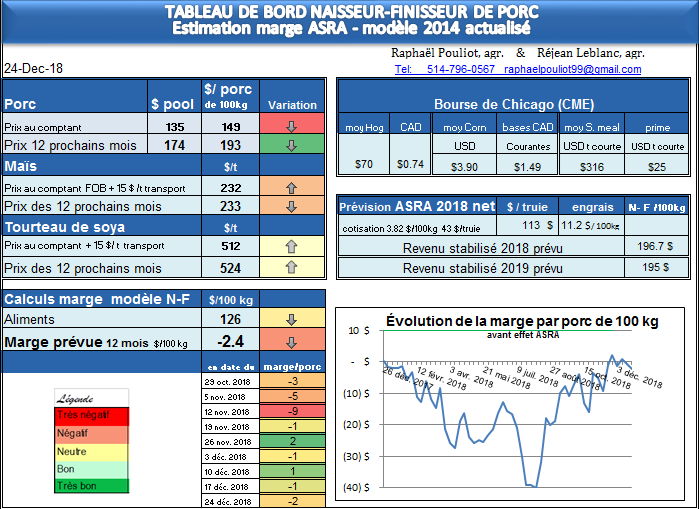 Lundi 24 décembre, la marge du modèle ASRA ( 306 truies et 5672 porcs vendus par an ) est –2.4 $ par porc de 100 kg pour la moyenne des 12 prochains mois, avec des ventes de 193 $ par porc de 100 kg.