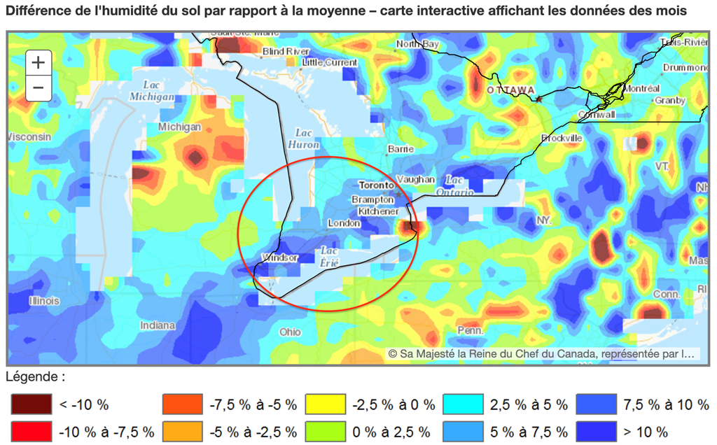 En Ontario, les sols affichent un excès d’humidité nettement au-dessus des normales.