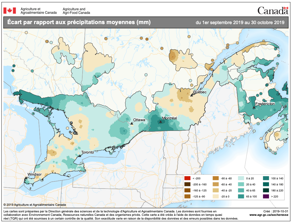 Dans la région de Saint-Hyacinthe, et elle n’est pas la seule, les accumulations d’eau d’octobre sont pour le moins impressionnantes à près de 203 mm, dépassant nettement les bonnes accumulations de 110 à 120 mm du printemps dernier. Il s’agit d’un niveau pratiquement record. Il faut remonter à 1983 pour observer des précipitations totales mensuelles aussi importantes qui avaient atteint alors 223 mm.