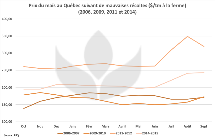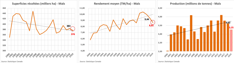 En septembre dernier, Statistique Canada prévoyait déjà un rendement dans le maïs en baisse de 3,6% à 9,1 tonnes/ha par rapport à l’an dernier. Avec une réduction également des superficies récoltées de 2%, la récolte de maïs affichait elle-même un recul prévu de -5,5% à seulement 3,42 millions de tonnes. Considérant la fin de saison difficile et les gels d’octobre, on peut cependant croire sans grande difficulté que le rendement moyen devrait reculé davantage. En utilisant une réduction conservatrice de 5%, il passerait à 8,65 tonnes/ha, un niveau comparable à 2014. Si c’est le cas, la récolte passerait alors à seulement 3,25 millions de tonnes, la plus faible depuis 2014 à 3,15 millions de tonnes.
