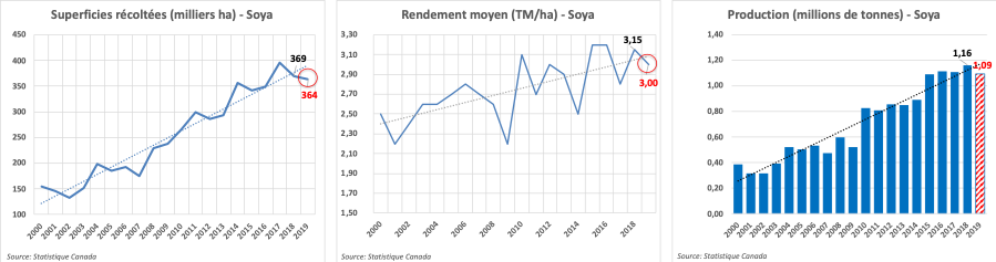 Si on se fit aux dernières prévisions de Statistique Canada de septembre, avec des superficies récoltées en baisse de 1,4%, mais un rendement en hausse de 1,6% à 3,2 tonnes/ha, la récolte québécoise de soya se devrait d’être cette année de 1,17 millions de tonnes, soit légèrement plus que les 1,16 millions de tonnes de l’an dernier. Considérant cependant les rendements qui ont été rapportés cet automne, on peut se questionner à l’effet que la moyenne québécoise puisse vraiment s’établir à 3,2 tonnes/ha. Basé sur un rendement moyen plus « conservateur » d’au mieux 3,0 tonnes/ha (1,2 tonne/acre), la récolte de soya se situerait alors à 1,09 millions de tonnes, la plus faible depuis 2015. Il ne serait pas nécessairement étonnant non plus que celle-ci passe sous la barre du million de tonnes.