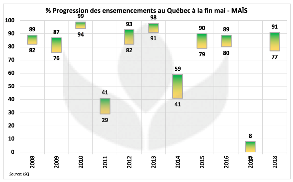 Sans surprise, selon la première évaluation de l’année de l’état des cultures par la Financière agricole du Québec, présentée par l’Institut de la statistique du Québec, en date du mardi 22 mai dernier, déjà une bonne proportion des ensemencements de maïs étaient complétés, dans une fourchette de 77 à 91%.