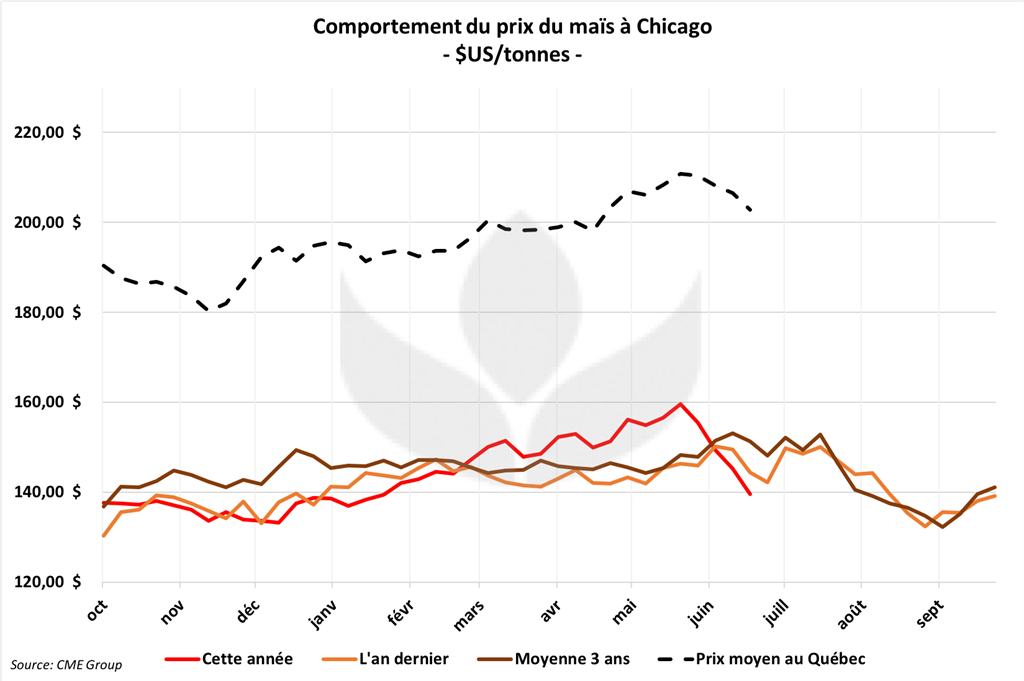 À l’image des conditions pour les cultures au Québec, celles aux États-Unis sont jusqu’ici remarquables, les meilleurs depuis plusieurs années. L’idée que de nouveaux rendements record soient au rendez-vous cet automne fait du chemin et, à Chicago, les spéculateurs en ont pris bonne note. Bien entendu, les sauts humeurs et menaces commerciales de M. Trump ajoute des inquiétudes supplémentaires dans l’air.