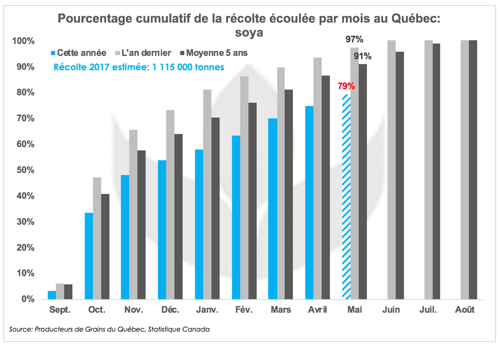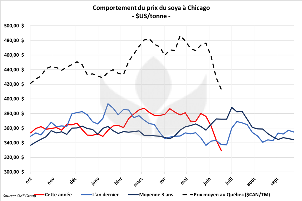 Le cas du soya apparait plus préoccupant. Malgré la forte baisse à Chicago, les acheteurs au Québec n’ont pas particulièrement manifesté d’intérêt à supporter dernièrement les prix. On peut certainement encore espérer un rebond à la bourse, mais le risque demeure que les prix au Québec restent encore lourds d’ici les récoltes à défaut d’intérêt des acheteurs.