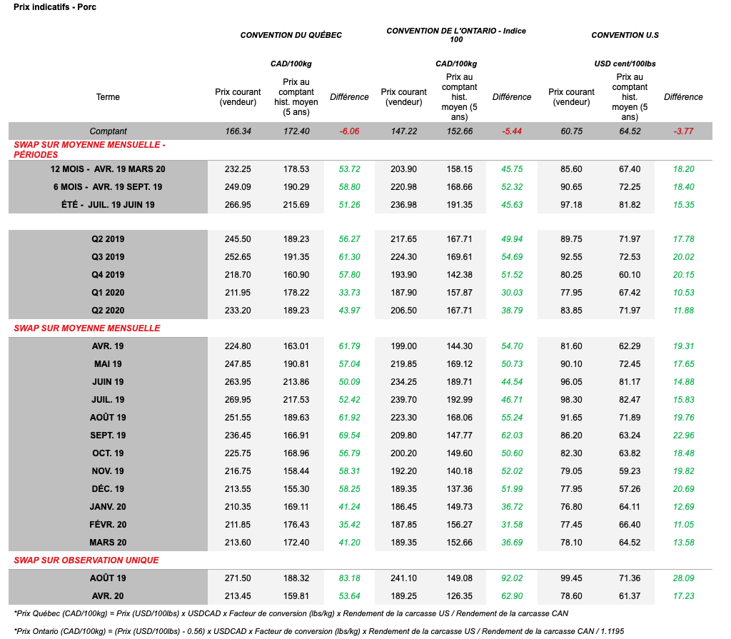 Voici les prix les plus récents sur le marché du porc et des grains: