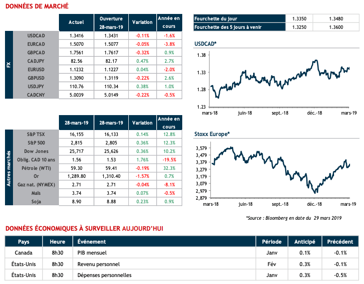 La constatation hier que la croissance économique aux États-Unis avait ralenti plus que prévu au 4e trimestre (passant de 2.6% à 2.2%) n’aura finalement pas trop affecté le billet vert. Bien qu’intéressante pour les statistiques des accomplissements du Président Trump, il n’en demeure pas moins qu’il est question de 2018 alors que l’attention est davantage tournée vers cette année. Nous pouvons également rajouter à cette théorie les commentaires du président du district de New York de la Réserve fédérale américaine (Fed), John Williams, qui est venu tempérer les craintes d’une récession. M. Williams, un des membres influents de la Fed estime que l’activité économique enregistrera un rebond au second trimestre et juge exagérée l’anticipation d’une baisse du taux directeur. À 10h30 ce matin, nous aurons droit aux commentaires de Robert Kaplan, président du district de Dallas de la Fed.