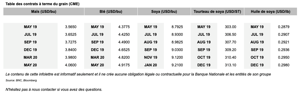 Voici les prix les plus récents sur le marché du porc et des grains: