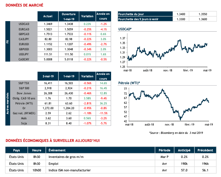 Les investisseurs surveilleront avec attention ce matin les données d’emploi du mois d’avril aux États-Unis. Un chiffre au-delà des attentes ne ferait qu’accélérer la poussée du dollar américain en laissant entrevoir une politique monétaire moins accommodante au cours des prochains mois.