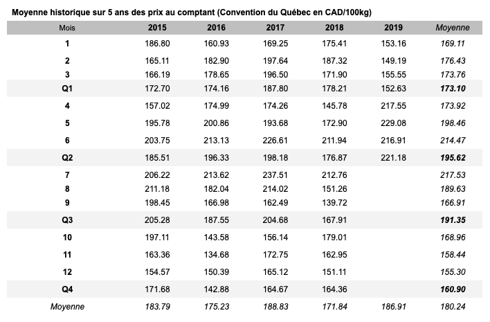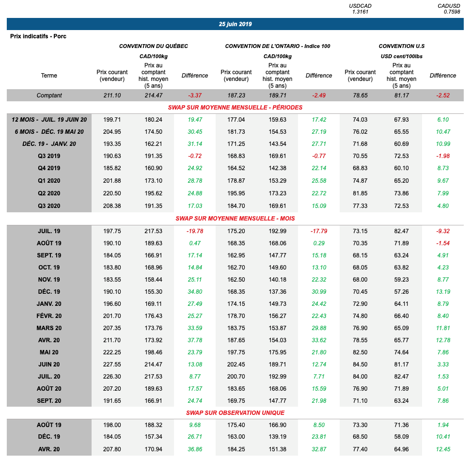 Voici les prix les plus récents sur le marché du porc et des grains: