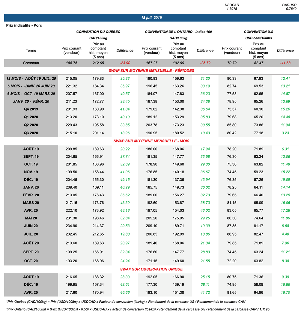- Les valeurs de découpe du porc ont augmenté de 77 cents hier, à 75,24 USD/lb.