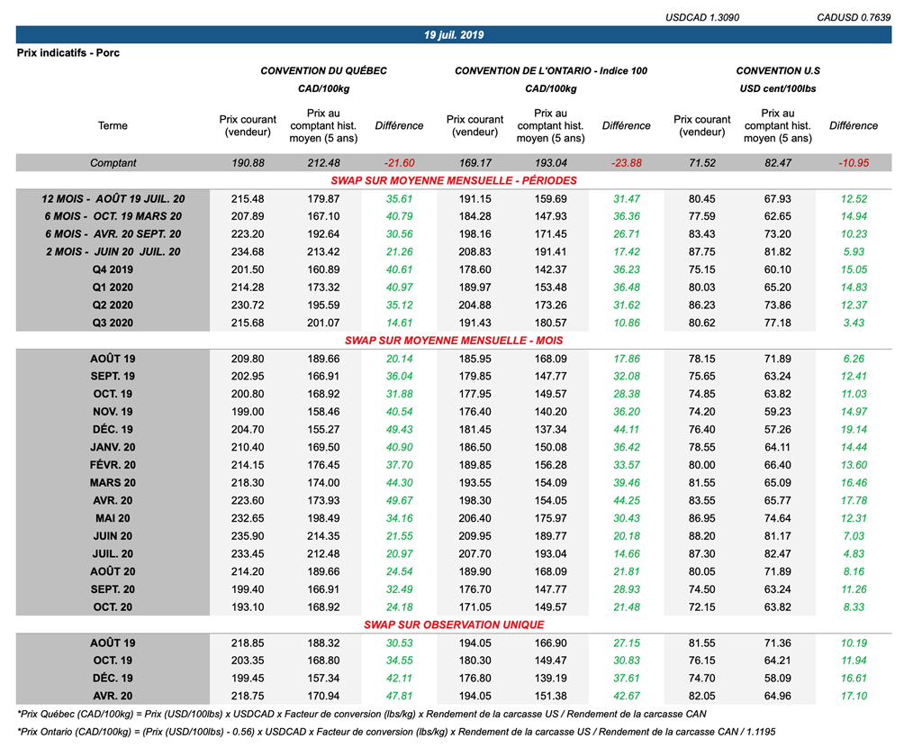 Voici les prix les plus récents sur le marché du porc et des grains: