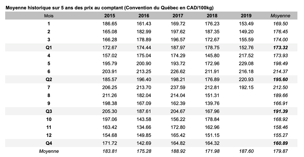 Voici les prix les plus récents sur le marché du porc et des grains: