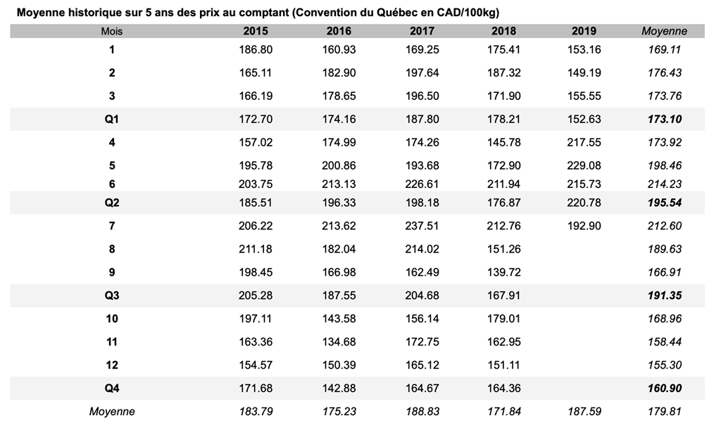 Voici les prix les plus récents sur le marché du porc et des grains: